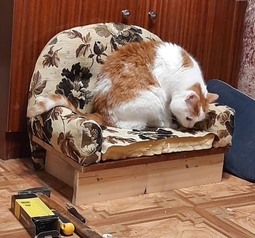 Все таки маловат получился по их отзывам, не получается во всю длину вытянуть лапки, ну учтем на будущее, все таки кота то два, значит второй диван надо будет делать, но потом, все потом, на пока энтузиазм закончился.