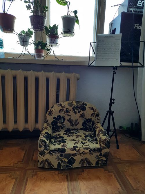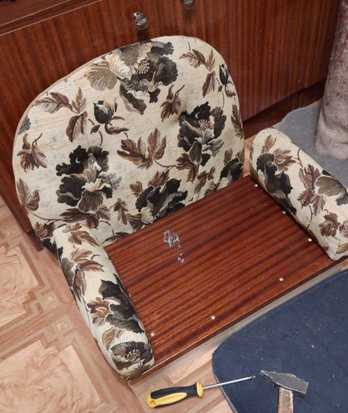 Обернул, зафиксировал, дальше нужно это обтянуть тканью, тут у меня пробел в знаниях, поэтому обратился за помощью к Татьяне. Она тут же нашла какую то цветастую ненужную тряпку и скроила чехлы. На подлокотниках их просто зашили, а на основе я натягивал и фиксировал гвоздиками.