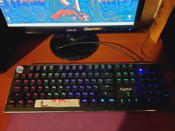 Ну и про собственно клавиатуру, она из дешевой механики, сравнивать особо не с чем, но по ощущениям мне понравилась, не слишком шумная, вполне умеренный ход клавиш, тактильные ощущения приятные, залипаний пока не обнаружено, но вот подсветка. Ну реально хоть 10, хоть 30 режимов, нафига? Если ты не умеешь печатать вслепую, то без постоянной подсветки просто ничего не видно и другие варианты отпадают, точнее их можно использовать в качестве цветомузыки например - включил плеер, погасил монитор и наслаждаешься. Неужели все геймеры печатают вслепую? Ну я хорошо знаю раскладку, приходилось и по русски писать на клавах без кириллицы и почти без ошибок, я просто визуально хорошо помню где должна быть буква, но постоянно в таком режиме будет очень не комфортно, доча точно не сможет, поэтому включил подсветку на постоянной основе(спасибо производителю, что предусмотрели этот вариант) проверил что после перезагрузки режим сохраняется и не нужно его переключать каждый раз. Ну и все клавиатурка, добро пожаловать.