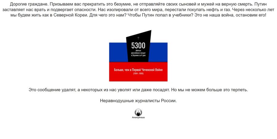 Хакеры из группировки Anonymous взломали сегодня сайты ТАСС, Коммерсанта и Известий и повесили такой свой баннер