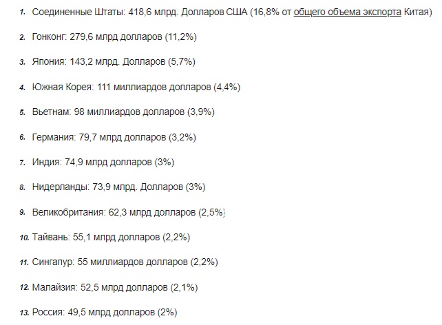 Видите какой процент экспорта Китая составляет "Великая" ничего не производящая Россия? 2% это потеря которую Китай легко переживет, более того Китай интересует только Китай, до России ему дела нет, Россия сама ему скоро бесплатно начнет поставлять ресурсы, а вот с США им есть о чем поговорить.