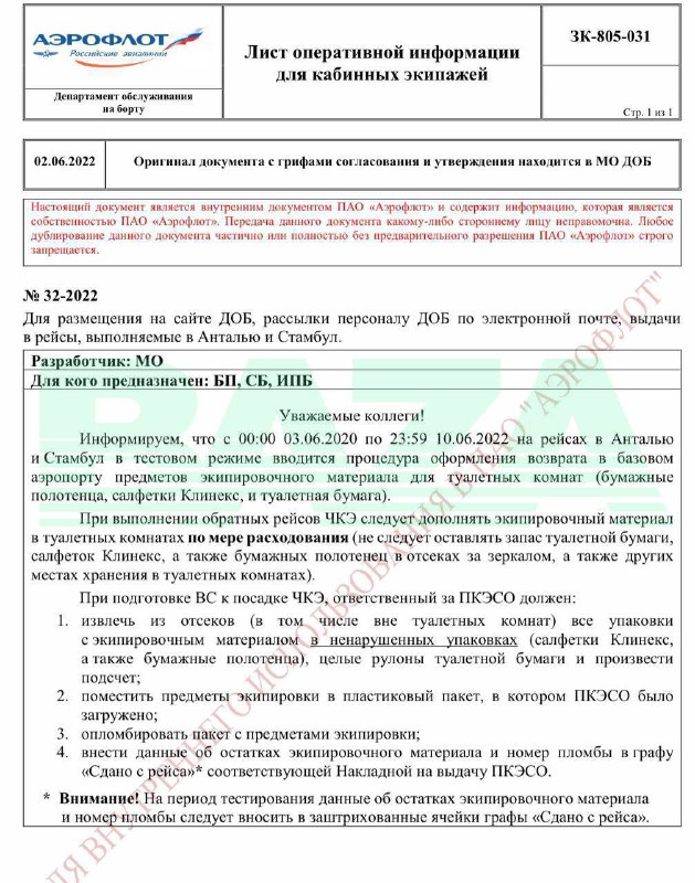 На рейсах авиакомпании теперь ведётся строгий учёт бумажной продукции: туалетной бумаги, салфеток и бумажных полотенец. Сотрудникам кабинного экипажа пришел распорядок о введении таких мер в тестовом режиме до с 3 по 10 июня. Но практику могут ввести и на постоянной основе.