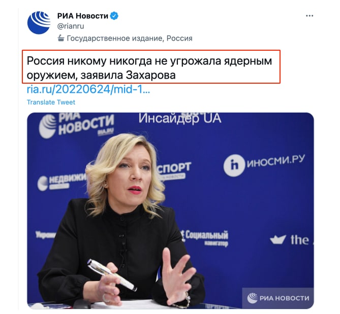 Никому не угрожала, просто глава Роскосмоса публиковал фоточки от ракетной воронки и советовал соседям говорить с Россией повежливее, просто показывали мультики как ракеты "Сармат" уничтожают города Европы за несколько минут, просто телеведущий рассказывал как мы всех превратим в радиоактивный пепел, просто президент РФ пригрозил мерами которых еще не знала история и перевел стратегические войска в особый режим. Нет никто никогда не угрожал. Уже просто нет надобности думать когда в кремле врут, а когда нет. Они лгут всегда, безостановочно.