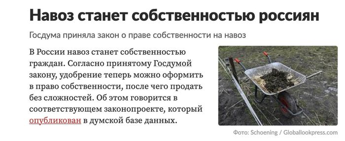 Кстати, недавно правительство преподнесло им просто царский подарок, россиянам разрешили право собственности на навоз, вот им видимо по плану великого стратега россиянам и предстоит питаться в ближайшее время, назло Омерике конечно.