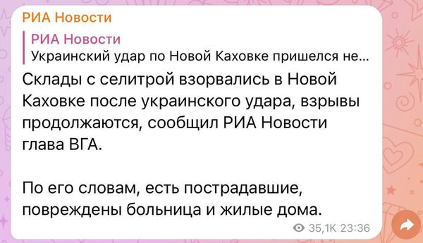 ЗСУ с помощью высокоточных ракет из установок HIMARS за пару дней накрыли уже 14 крупных целей. Склады боеприпасов и штабы. В российских каналах пытаются это скрывать, сообщая ложную информацию, но ввиду несогласованности, в панике меняют версии на ходу. Это очень забавно читать. В Новой Каховке накрыли склад ракет, бабахало всю ночь и день и вот как это выглядело в Zчате: