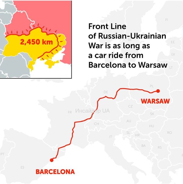 Это как вы понимаете длина линии фронта которую обороняют украинцы. Да, в европе этого просто не понимают. Европа мала, поэтому такая структура как НАТО там весьма оправдана, но Украина одна сдерживает фронт размером в пол-европы и это очень полезно увидеть европейцам которые еще не оценили серьезности происходящего. Украина спасает вас всех сейчас.