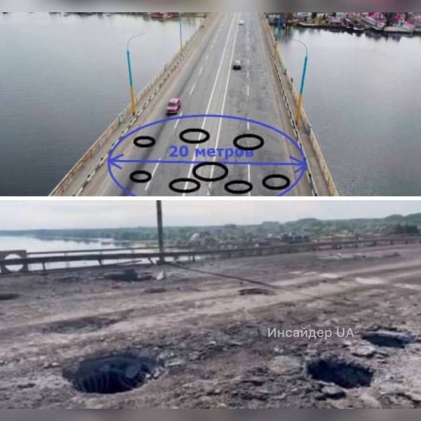 Это результат обстрела моста из установки HIMARS, 12 ракет в кассете, с расстояния в 50км примерно вот такая кучность.
