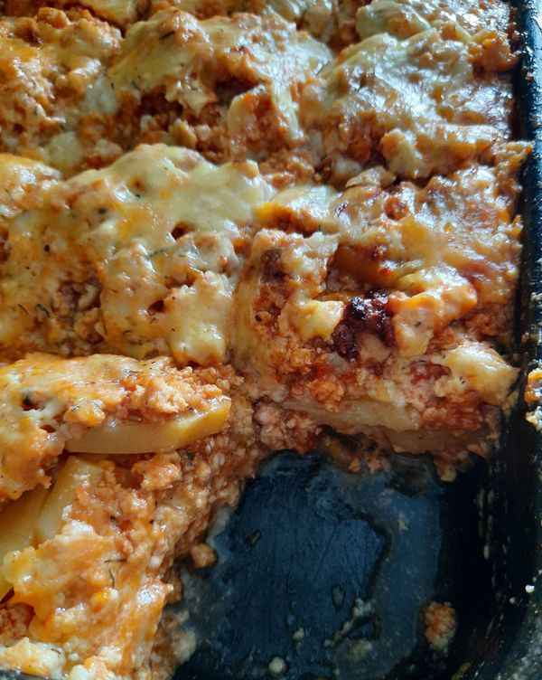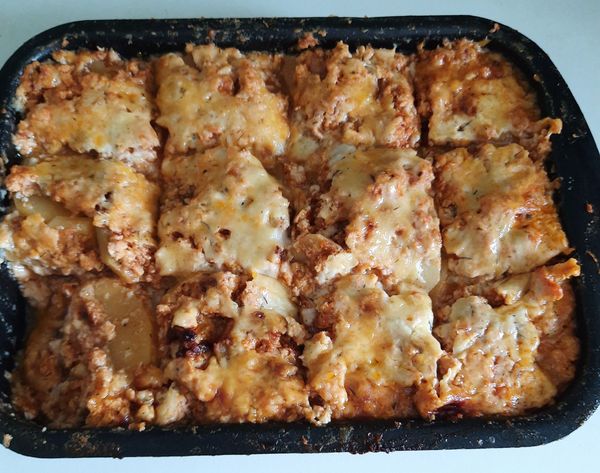 Сегодня решил попробовать что-то новое и приготовил картофельную лазанью. Все как с обычной лазаньей, только вместо листов теста тонко нарезанный картофель. Получилось вроде съедобно. Даже пожалуй вполне вкусно. Но сразу скажу это был последний раз когда я что-то делал с этим чертовым картофелем. Проще было его отварить и с мясом поесть чем вот это вот все. Полтора часа его готовил, все течет, всю духовку залило соусом, все горит, а картофель еще сырой. Есть мнение что стоило его сначала отварить, но какой смысл тогда потом готовить лазанью с уже всем готовым, можно просто поесть этого картофеля с уже готовым мясным соусом. Короче фигня эта ваша картофельная лазанья. Вкусно, но ей богу не стоит потраченного времени и сил. Или готовить обычную лазанью, или просто картошку с мясом.