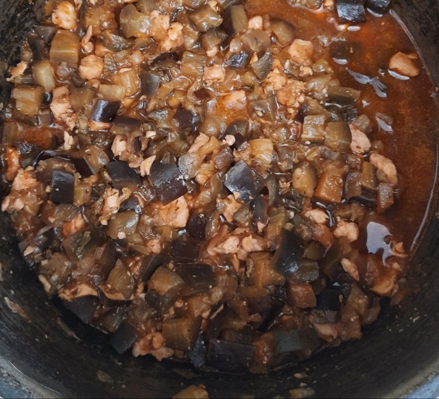 Вот так я решил назвать свой сегодняшний ужин:) В холодильнике скопилась куча баклажанов, а я вообще не знаю что из них можно готовить. Хранятся они плохо и уже начали портится, так что нужно было срочно что-то решать. Хорошо и быстро у меня получается как правило минестроне и болоньезе, поэтому выбор пал на болоньезе. Быстренько зажарил все необходимое, только вместо фарша просто мелко пошинковал слегка размороженное мясо, просто лень было фарш делать, а готового не было. Все остальное как положено лук, чеснок и тому подобные помидорки. Когда соус приготовился я туда закинул целую кастрюлю мелко порезанных баклажанов, пришлось перебросить в старый горшок от мультиварки, потому как в сковороду такой объем просто не помещался. Потом, в процессе, они сильно уменьшились до нужных размеров, но в сковороде я бы это никак не приготовил. Все, оставил это дело тушиться минут двадцать и вуаля, отличное бакланьезе готово!