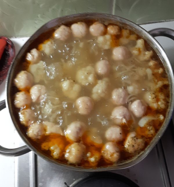 А вместо минестроне в этот раз завел супчик с фрикадельками которые нашел в холодильнике когда искал фарш и раз уж экспериментируем добавил туда цветной капусты, посмотрим как получится. Мне кажется не очень удачное сочетание, но надеюсь съедобное.