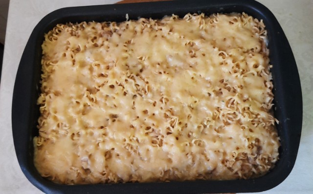 Пришла вот идея, из серии, а что будет если... В тот раз, если сделать карбонару с лапшой быстрого приготовления. Пожарил мяса с чесночком, завел как обычно яичный соус с тертым сыром. Главная сложность как туда завести лапшу. Залил кипятком немного и помешивая подождал пока впитает воду сколько сможет, минут пять, дольше ждать не стал. Все перемешал и на противень. Посыпал тертым сыром и в духовку на 15 минут.