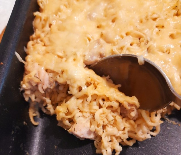 Как я и опасался, лапша которая выступала над сыром конечно высохла, но внутри получилось очень сочно и вкусно. Своеобразно конечно, но мы поели с удовольствием.