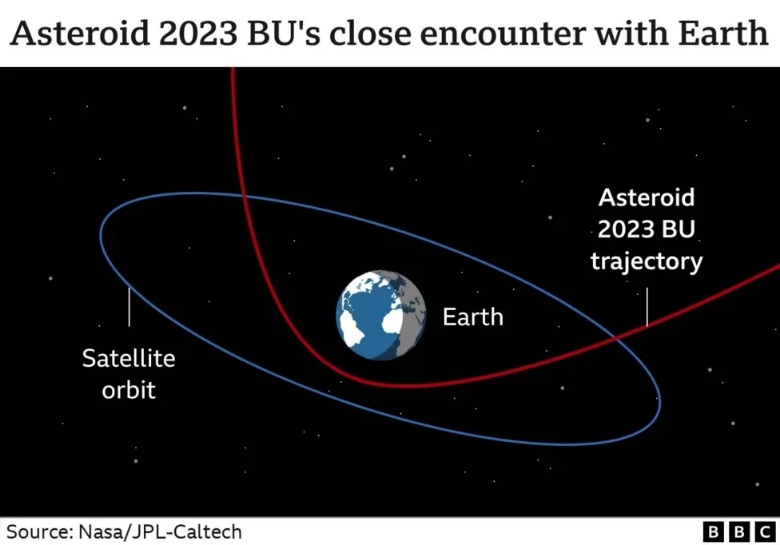 Земляне опять разминулись с нежданным инопланетным гостем. Астероид получивший обозначение 2023BU был случайно замечен астрономом любителем и просвистел буквально над ухом по астрономическим масштабам, в 3600км в перигее. В десять раз ближе чем спутники на орбите земли!