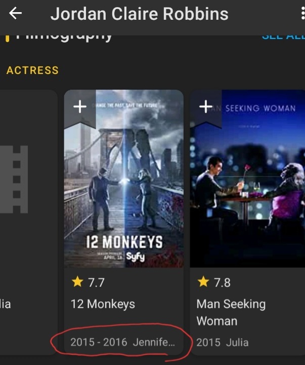 Плохое соединение и шуточки IMDB меня чуть с ума не свели. Просматривал актерский состав в одном шоу, показалось одно лицо знакомое, Джордан Клэр Роббинс. Ткнул посмотреть ее портфолио и вижу вдруг постер "12 обезьян"! Да ладнА! сказал я, "а кого она там могла играть?" а IMDB мне и говорит: Jennife..