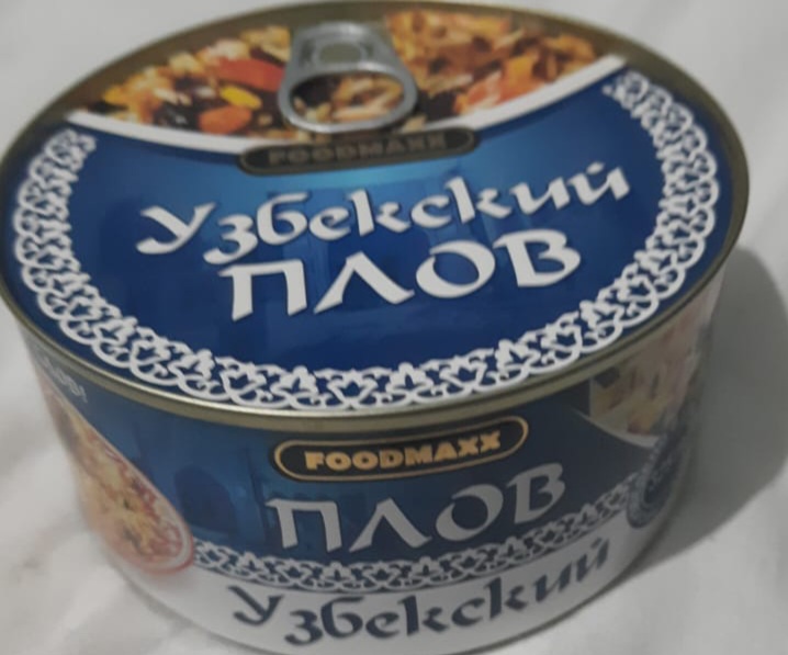 Я сейчас напишу совершенно видимо богохульную и крамольную вещь для узбеков и прочих любителей плова. Я вообще плов редко делаю и конечно совсем не так как на востоке. А там с пловом ситуация как с рецептами пасты в Италии, настоящии баталии какой плов тру, а какой не тру, мешать или не мешать - вот в чем вопрос. Я как- то далек от этого, для меня плов это просто рис с мясом тушеный в казане или вроде того. Но раз уж я в Ташкенте, можно и попробовать, вдруг проникнусь. Нашел в магазине такую консерву:
