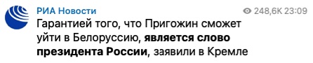 Итого. Пригожин слился. Мои предположения: Были достигнуты соглашения по первому сценарию, Шойгу и Герасимова возможно подвинут на другие должности, всем амнистия на первое время, Пригожин со своей братвой улетает в солнечную африку и все счастливы, кроме тех кто остался. И в перспективе и Пригожина. Как можно договариваться с лжецом и известным отравителем?