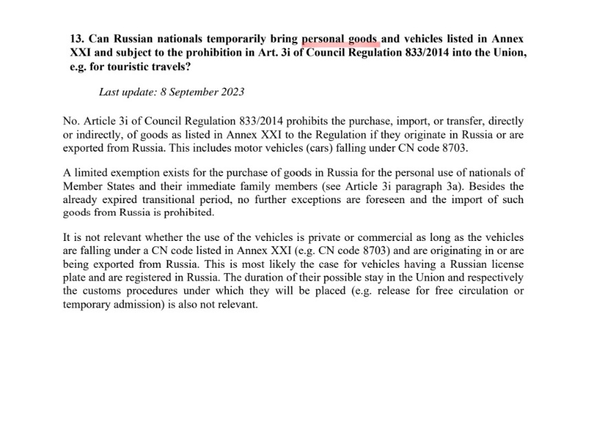 Спущенный документ это никакая не новая резолюция, это просто разъяснение, FAQ как принято говорить в интернете. Почему вообще возникла эта ситуация? В европе много языков, а в документах не всегда удачные формулировки, и в переводе на немецкий кто-то усмотрел что автомобили из рф подлежат конфискации. Напомню, документ действует с 2014г и только в этом году какой-то ретивый таможенник обнаружил этот пункт и начал реализовывать.