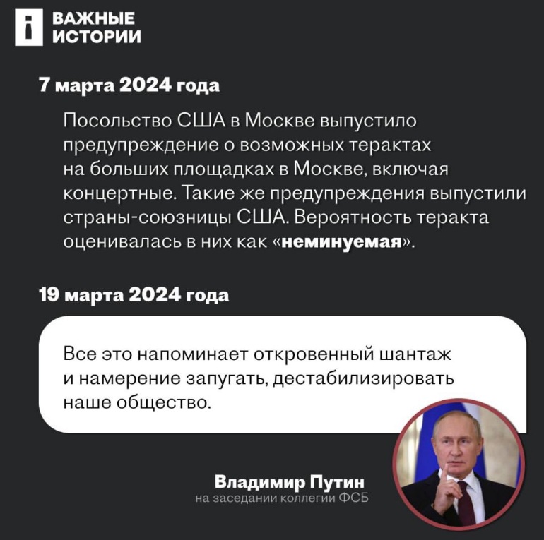 Upd. Ну вот и произошло обращение военного преступника путина к народу, украинский след и прочий бред, что требовалось доказать. Это операция ФСБ никаких сомнений, психопату путину плевать на свой народ. Никогда он не вылазил на свет божий после терактов кроме случаев когда сам их организовал. Стало быть грядет официальный переход на военное положение и мобилизация, никто другого и не ожидал.