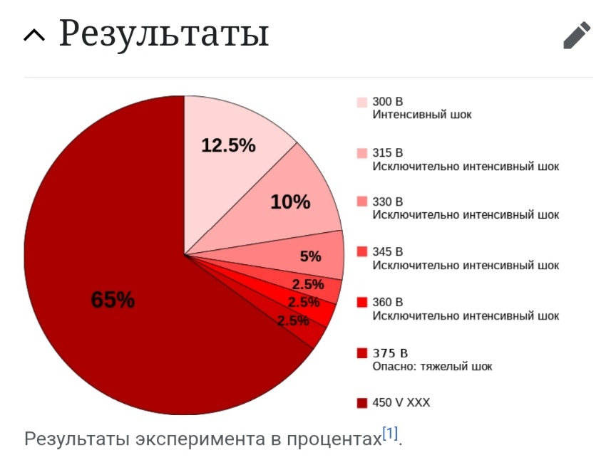 абсолютное большинство, 65% участников, или две трети полностью выполнили все инструкции "запытав" "случайного" человека до смерти дойдя до конца шкалы, только потому что не могли возражать воле руководителя эксперимента! "Я просто выполнял приказ" - именно так говорили почти все судимые нацисты в Нюрнберге.
