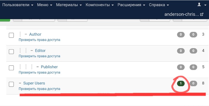 Если там пользователей больше чем нужно, а в списке пользователей таких нет, то это наш случай - сайт взломали и прописали админов прямо в базу данных. Никакими средствами CMS вы их удалить не сможете. Поэтому идем в админку вашего хостинга и открываем базу данных через phpMyAdmin, но сначала выписываем ID тех суперепользователей которых сами создавали и запоминаем ID самой группы Super Users, на моем скрине это 8, последняя колонка.