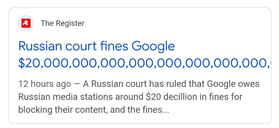 Наткнулся тут на новость о том, что российский суд намерен отсудить у Google мегасумму за блокировку в YouTube рашистских пропагандистских каналов. Изначально сумма была меньше, но она постоянно увеличивается за каждый день просрочки и на данный момент достигла отметки в 20 дециллионов долларов. Смешно конечно, потому как это на много порядков превосходит денежную массу всей планеты.